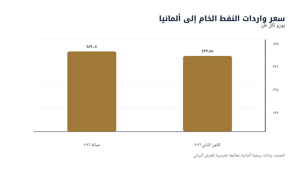 [١١] المكتب الاتحادي للإحصاء الألماني (ديستاتيس)، «الواردات الشهرية من النفط الخام» و«أسعار الواردات في شباط/فبراير 2026»، جداول وبيانات رسمية، آذار/مارس 2026.