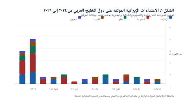 الشكل (١): الاعتداءات الإيرانية الموثقة على دول الخليج العربي من ٢٠٢٤ إلى ٢٠٢٦.
